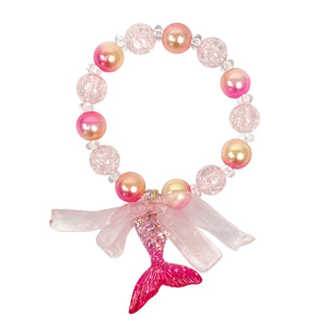 Featuring a pink magical mermaid tail pendant with soft sheer bow. Designed coordinating pearly, pink beads and glittering beads on a quality stretch elastic for the perfect fit.
