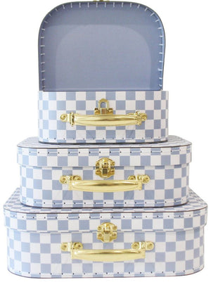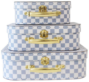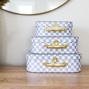 Beautiful  Blue Check design by Alimrose. Made from a durable card material and finished in a matte style. The three cases are stunning stacked on one another on a shelf, desk or drawers. Perfect for gift giving or for your little one to carry around & keep their special treasures inside.