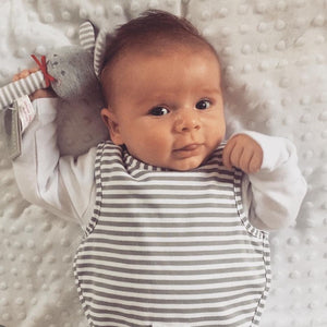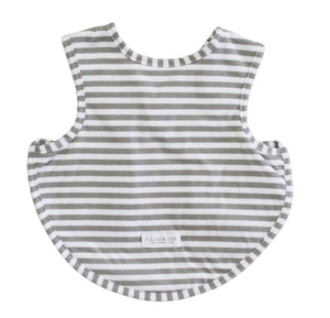 Great toddler bib, back fastening in sweet neutral grey & white stripe.