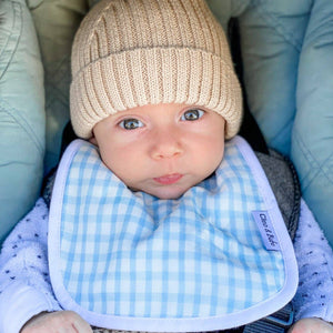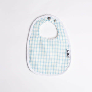 Baby Blue Gingham - A Classic pattern with a beautiful white trim adds a touch of elegance to your baby's outfit. Made from absorbent muslin cotton front, this bib is gentle on your baby's delicate skin. Featuring a waterproof layer in the middle made from high-quality PUL material, which helps keep your baby's skin dry from drooling, leaks, and spills. This feature eliminates the occurrence of rashes and skin irritations, keeping your baby comfortable all day long. Designed with two heavy-duty snap clips that make it secure for your baby not to pull off, yet easy for you to put on and take off. The towelling back ensures that your baby remains comfortable while wearing the bib. The adjustable snap clips make it suitable for use from newborn age. Designed in Melbourne, Australia, and is machine washable with like colours, maki