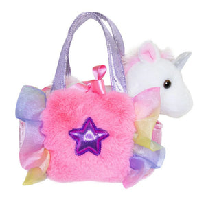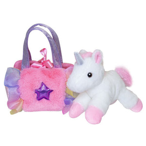 Soft plush toy Unicorn which sits comfortably inside a cute velour pink frill star hand bag.  Let your pet sit inside and take him everywhere with you or pull him out and give him cuddles anytime.
