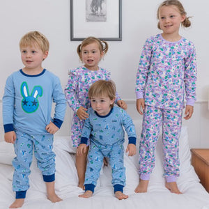 Milky Clothing Rascal Bunny PJs bring all the fun for bedtime. The top features a bold bunny graphic on a surf blue base, perfect for little personalities who like to hop to their own beat. Made for cool nights and cosy cuddles, this set includes a long sleeve top and stretchy waistband pants in a playful all-over print featuring cheeky bunny motifs. Designed in a soft, breathable cotton blend for all-night comfort (and early-morning giggles).