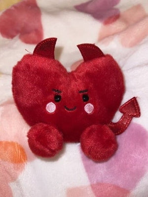 Klaus Heart is a striking red heart plushie, with playful devil horns, a mischievous grin, and a devilish tail.