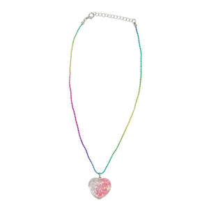 Behold the enchanting Mermaid Heart Necklace! This charming piece showcases a heart shaped resin pendant holding shimmering glitter shapes in soft pink and dazzling white. Its rainbow necklace, an exquisite addition, extends the colour palette! Plus, the adjustable clasp closure ensures a perfect fit for all!