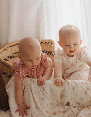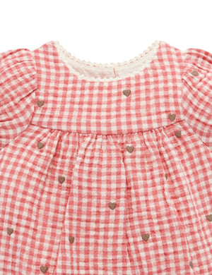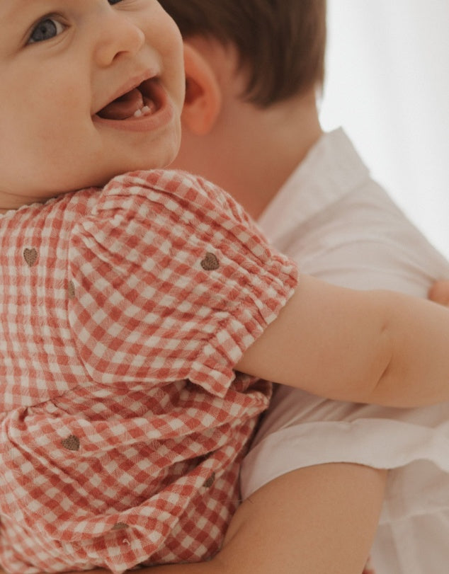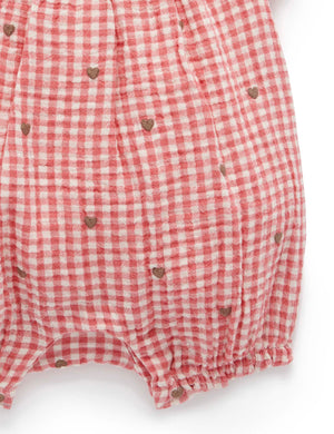 This heart Embroidered Romper is the perfect lightweight summer style. Featuring a sweet all over watercolour floral print and puffed cap sleeves. Designed as a balloon style, with snap clips for easy dressing and gathers around the legs for a comfortable fit. Made from the softest 100% Organic Cotton muslin for a breathable outfit.   Gingham pattern with all over heart embroidery Rick rack neckline detail Puffed cap sleeves with elasticised cuffs Balloon style for comfort Snap clips at the leg for easy dressing and back neck buttons Made from 100% Organic Cotton Muslin
