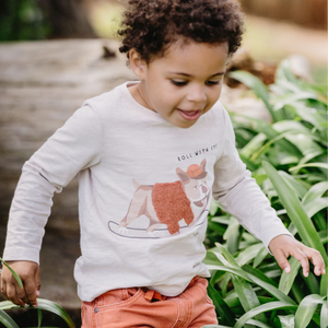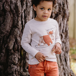 This long sleeve crew neck tee features a cool dog on a skateboard graphic on the front, concealed press stud shoulder opening and rib neck band, making it a great basic for your little one's Winter wardrobe to wear back with the Cool dogs pull on knit denim pants for a complete outfit.