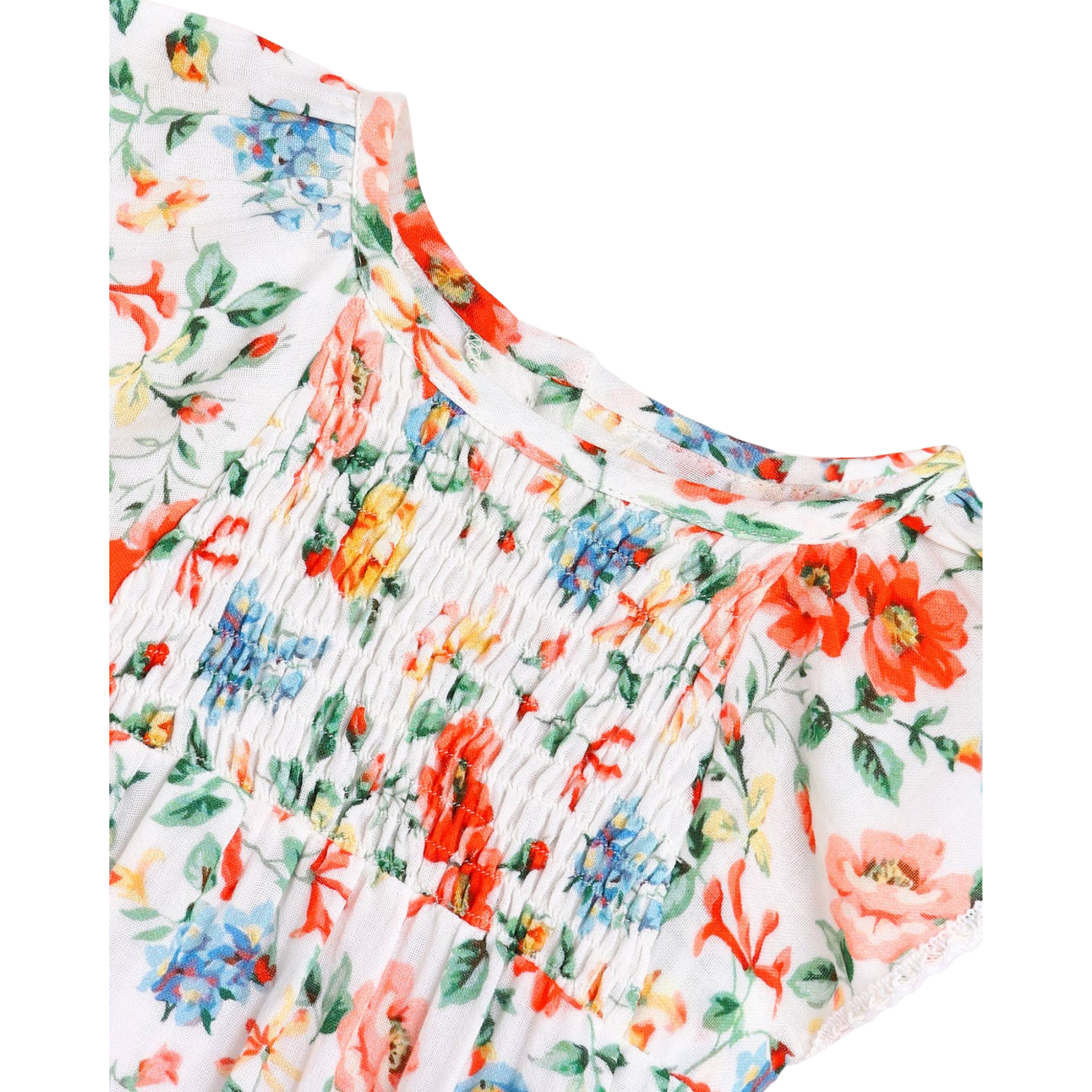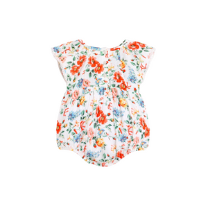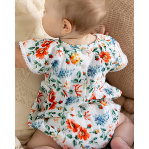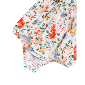 The Alice Playsuit in Pretty Floral features intricate shirring across the chest for a snug yet stretchy fit. Made from soft cotton gauze, the lightweight fabric is tailored into pretty sleeves and puffy legs, adding a playful and whimsical touch. It measures 40cm (for 6-12 months) and includes elasticated leg openings for comfort, a convenient snap-button closure at the bottom for easy dressing, and is finished with an elegant 8mm binding trim.
