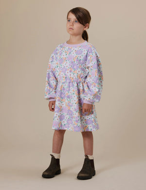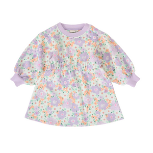 A charming lilac floral dress crafted from soft cotton terry for cozy, everyday elegance.