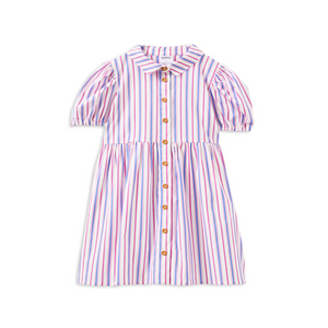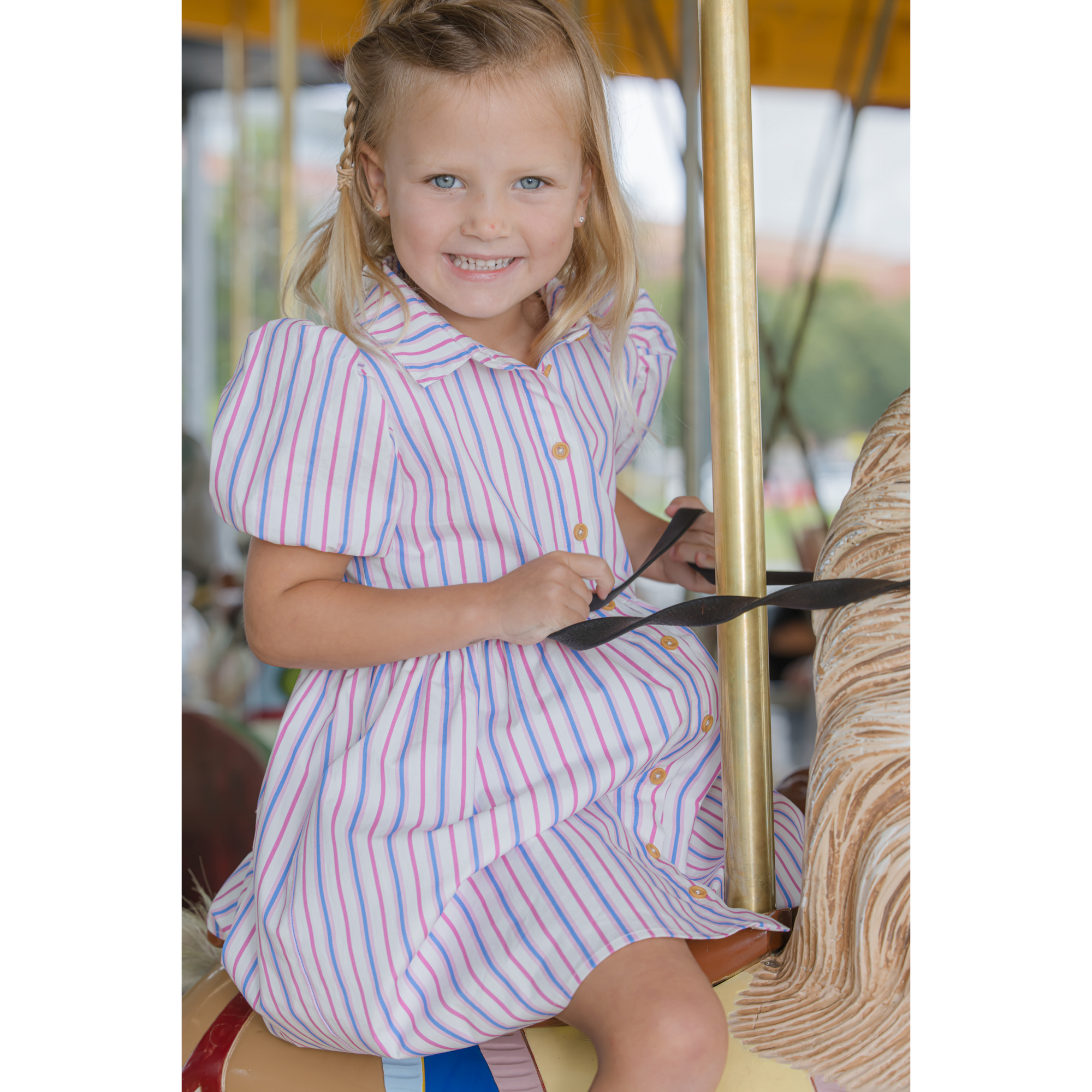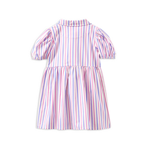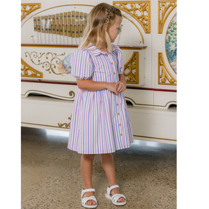 Milky Clothing Summer Stripe Dress. Brighten up your little one’s wardrobe with the Milky Clothing Summer Stripe Dress. With a fun candy coloured vertical stripe and button down front, this dress is made for warm weather adventures. Featuring a classic collar, short gathered sleeves, and a breezy A-line silhouette, it’s both playful and polished. Whether it’s a family outing or a day at preschool, this dress is an easy go-to for everyday wear.