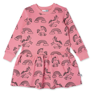 Super cool sweatshirting weight dress with dropped skirt hem, pockets and rouching at the skirt seam.