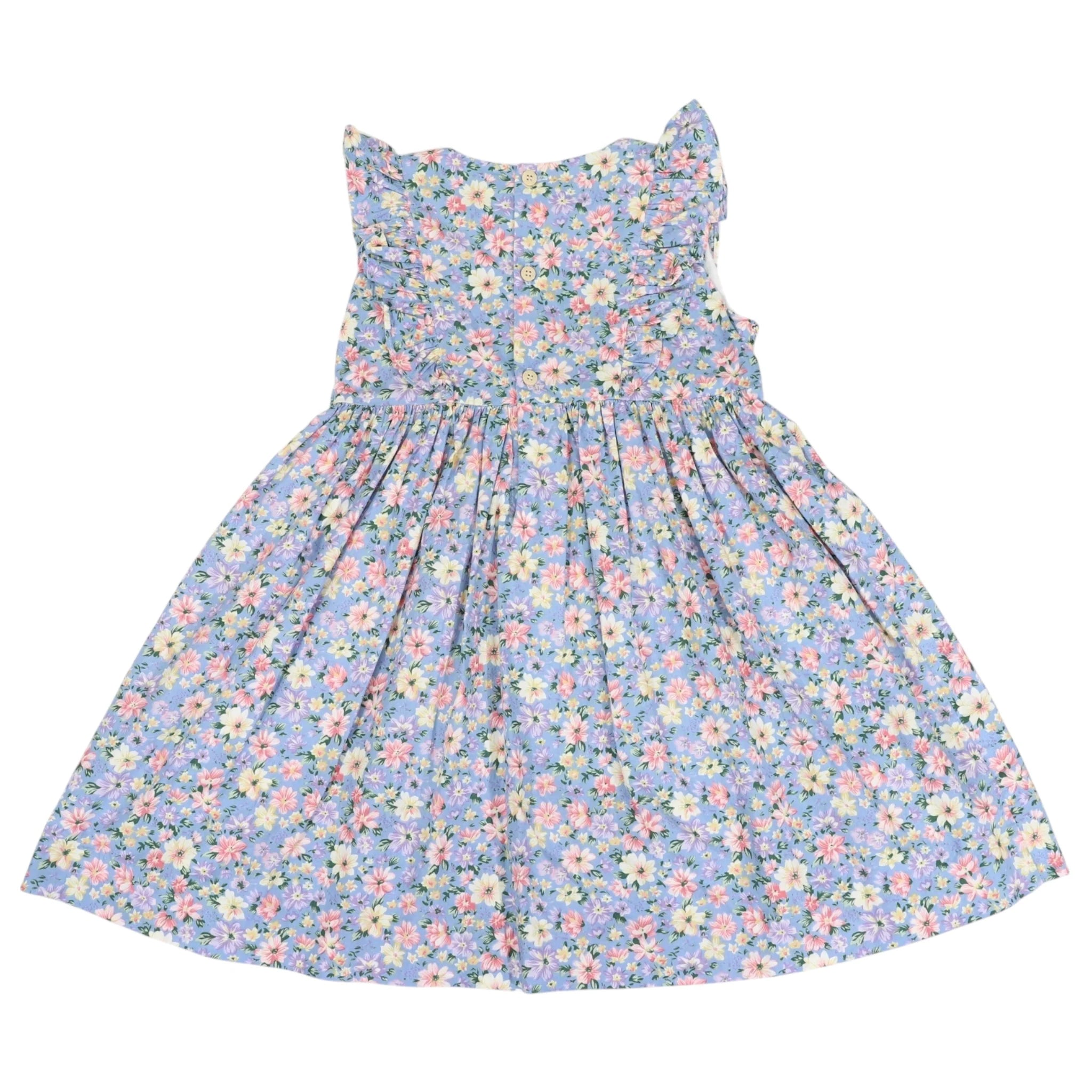 Add some floral fun to your little one's wardrobe with the Frill Dress in Blue Floral. Sweet frills on the bodice, a vibrant print, and a double-lined skirt make it ideal for twirling and playing. With a practical reverse placket, it.s stylish and easy to wear for any occasion.