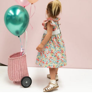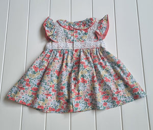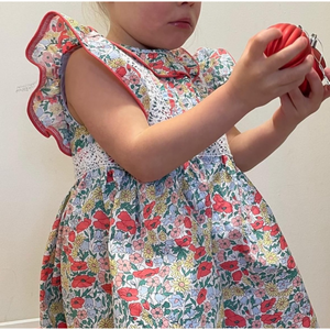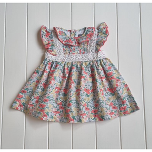This divine dress from Smox Rox features ruffle sleeve and neck, with pin tuck front,edged in pinafore style back and front lace. Watermelon buttons.
