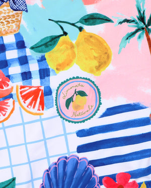 Bright, fun and full of coastal charm, this one-piece swimsuit features an Amalfi inspired vibrant patchwork of lemons, beach scenes, and painterly checks. Designed with a flattering scoop neck and stylish cross-back straps, it’s fully lined for comfort and perfect for long days by the pool or sea.