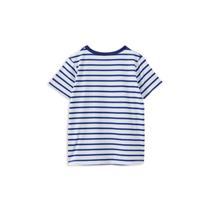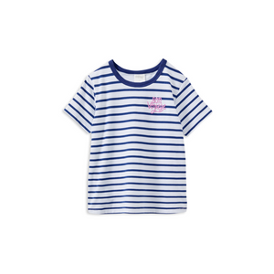 "Milky Clothing Bon Voyage Tee is a versatile essential for your little ones summer wardrobe. Crafted on a white base with a navy horizontal stripe with a pink 'Bon Voyage' print (on the wearers left chest) this timeless piece offers effortless style for any occasion. Featuring a classic round neckline and short sleeves ensuring a seamless fit. Pair it with your favorite Milky shorts or skirt for a casual look, and layer with pants or a cardigan when the weather cools down. Also available in pink and red, this tee is designed to withstand wash after wash, promising lasting comfort and style."
