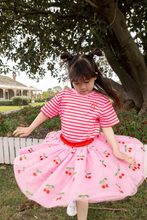 Milky Clothing Cherry Tutu Skirt is the perfect mix of sparkle and play. With a soft pink base and glittery cherry print across the layered tulle, this skirt brings the fun to festive season outfits and beyond! Featuring a comfy elastic waistband, it's easy to pull on and perfect for twirling through Christmas, birthdays, or everyday dress-ups. Because who says tutus are just for parties?