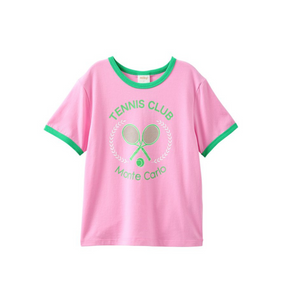 Milky Clothing Tennis Club Tee. Serve up some serious summer style with the Milky Clothing Tennis Club Tee! This fun, bright pink tee is a must-have for trend-savvy kids. Featuring a playful centre front tennis themed print and a sporty touch of Irish green rib around the neckline and sleeves, it's perfect for active days or laid-back weekends. Comfortable, breathable, and right on-trend, this tee is a winner on and off the court!
