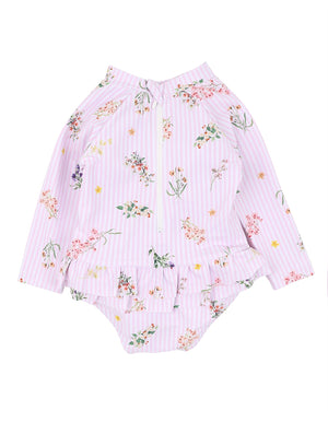 A sweet splash of sunshine and blooms this long sleeve rash suit is made for beach days and backyard paddling adventures. Scattered with delicate florals on soft pink stripes and finished with gentle frills at the front raglan seams and legs, it's as pretty as it is practical. The built-in aqua nappy ensures little ones stay comfy in and out of the water, while a back zip makes change time easy.