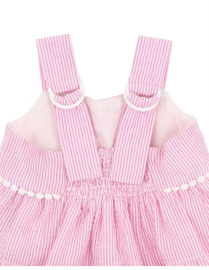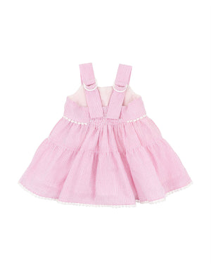 A sweet seersucker moment in soft pink and white, this tiered baby dress is made for sunshine days and garden play. Pretty pom pom trim and wide straps complete the charming look.
