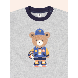 A long-sleeved round neck top in classic colour blocking. Made from cloud-like organic cotton, it features tummy-sized baller Huxbear embroidery in the softest furry fabric. Baby sizes include stainless steel shoulder snaps for even easier dressing.