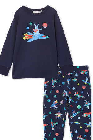Midnight Blue coloured base fabric top with centre front print, bottoms with space bunny all-over print