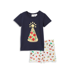 Milky Clothing Christmas Pizza PJs. Looking for a comfy-cute festive sleepwear set? Look no further than these PJs! Made from super soft cotton elastane that's hard-wearing they will retain their shape wash after wash. These PJs have a navy base tee with a centre front Christmas Tree Pizza print. The shorts have a silver marle base, with a delightful all-over, Christmas themed print.