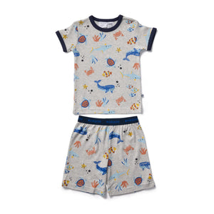 Dive into bedtime with this cool ocean-inspired pyjama set! Featuring an all-over sea life print with whales, crabs, and sharks, this soft grey melange set brings a splash of fun to summer nights. Made from 100% cotton for breathable comfort and easy, everyday wear.
