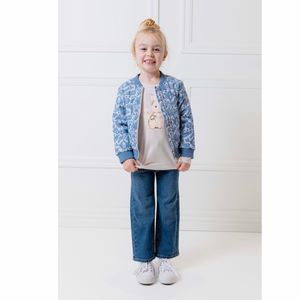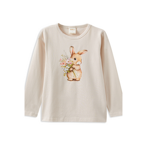 Milky Clothing Bunny Bouquet Tee. For those days when you need a versatile tee to pair with printed bottoms, this charming bunny print tee is your go-to option. It's ideal for adding a playful touch to any outfit, whether worn on its own or layered under a cardigan for extra warmth and style. Perfect for Easter celebrations, it pairs beautifully with the Daffodil Easter Flared Leggings for a fun, festive look.
