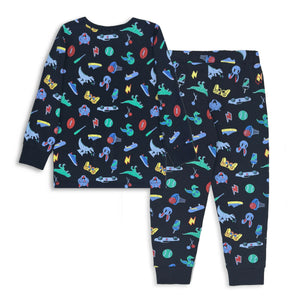 Introducing the Milky Clothing Playground PJ's—your little one’s new favorite sleepwear! These long-sleeve pajamas feature a playful all-over print filled with everything little boys love—tigers, dinosaurs, basketballs, skateboards, and more. Your child will delight in exploring the fun designs, making these PJs a must-have for wash, wear, and repeat throughout the winter.