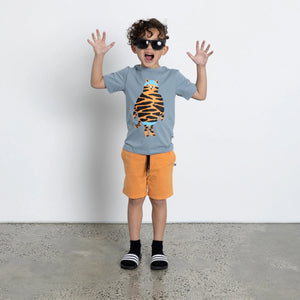 Tshirting weight short with elastic waistband, side pockets, back pocket and shoelace cord.