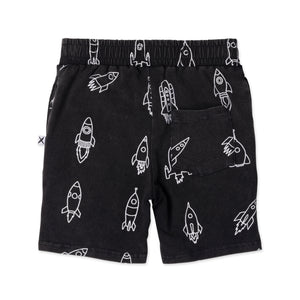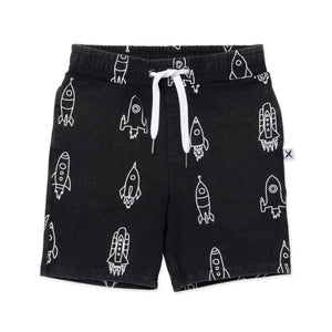 Tshirting weight short with elastic waistband, side pockets, back pocket and shoelace cord.