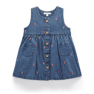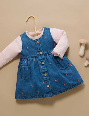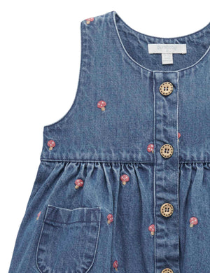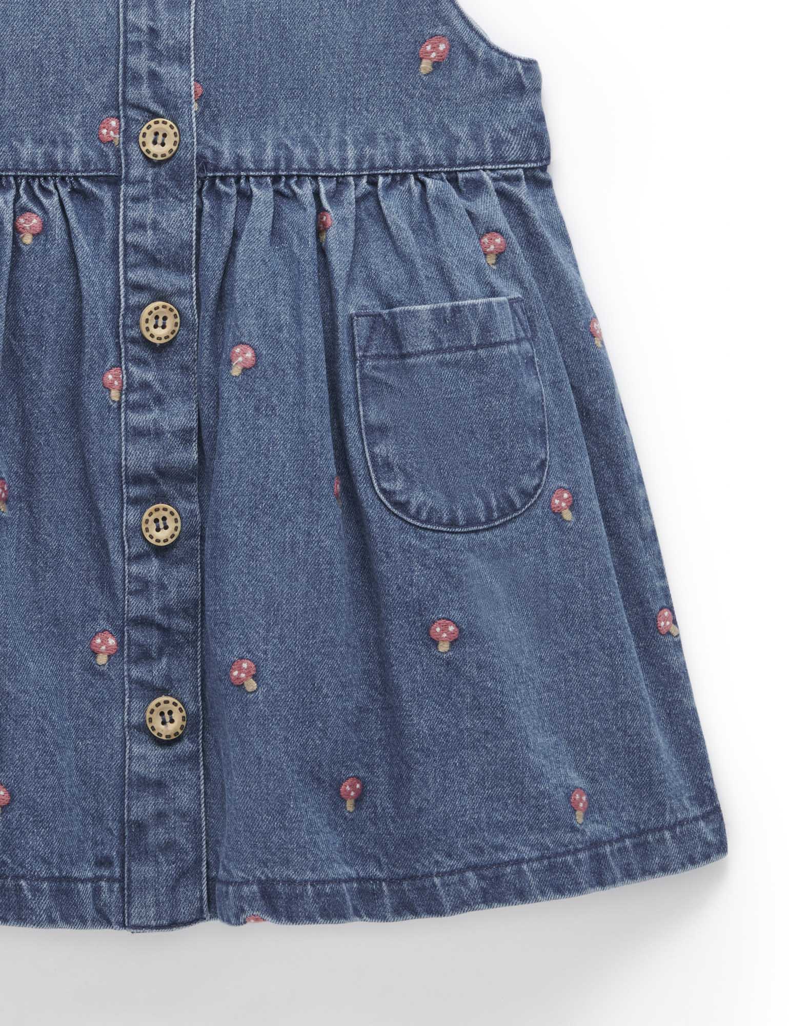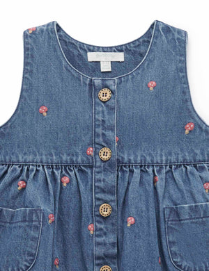 Our Toadstool Embroidered Pinnie is a versatile layering piece for transeasonal weather. Featuring a sweet all over toadstool embroidery, gathered skirt and wood look buttons. Made from 100% Cotton denim in a dark wash. Wear over our Pointelle Rib Layering Top to complete the look.   All over toadstool embroidery Front wood look buttons and patch pockets Gathered skirt 100% Cotton Denim