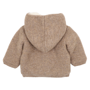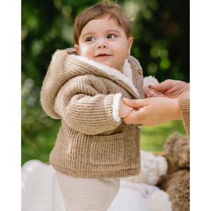This gorgeous biscuit fisherman's rib knitted hooded jacket with it's sherpa fleece lining is soft, warm, and comfy making it the perfect piece for winter layering. Featuring a button front opening with front patch pockets.