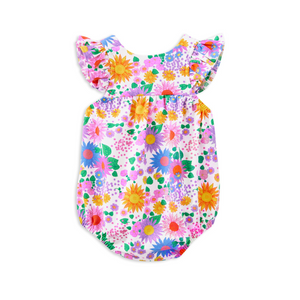 Milky Clothing Sunshine Floral Playsuit is an effortless outfit for your little one this summer. Made from cotton-rich fabric this playsuit allows for extra comfort on those warm days with soft elastic underarms & leg openings. With easy dressing in mind, the sweet frilled shoulder straps fasten at the bib front with covered snaps, also you will find snaps at the crotch to make change times a breeze.