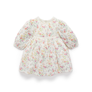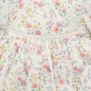 Our beautiful Lavender Dress is soft and flowy. Designed with a gathered skirt and elasticated cuffs. Made from the softest 100% Organic Cotton muslin with a pretty watercolour print of winter florals. Style with our Scalloped Cardigan and matching hair clips for a sweet outfit.