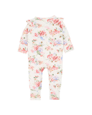 A cosy favorite for cooler days, the Anya Long Sleeve Zipsuit wraps your little one in comfort and timeless floral charm. Made from an Organic Cotton blend, this soft and breathable one-piece features a vintage-inspired bloom print in delicate pinks, corals, and blues on an ivory base. Thoughtful touches like the delicate shoulder frills, picot trim at the neckline, and a two way zip with a protective fold make dressing quick, safe, and fuss-free. Fold-over feet and mitten cuffs keep tiny feet and hands warm and help prevent scratches-perfect for newborns and little wrigglers. Perfect for daytime play or nighttime snuggles, this zipsuit is as practical as it is pretty. Complete the look with the Bloom Headband and Bloom Bunny Rug for a beautifully coordinated outfit or thoughtful gift set.