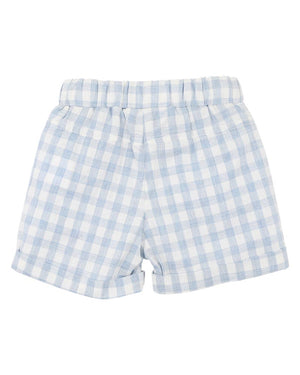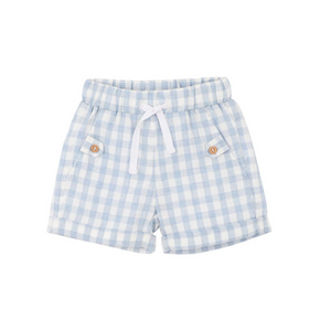 Whether it's a sunny afternoon at the park or a family day out, our Axel Check Shorts bring effortless charm to any little wardrobe. Crafted from soft cotton in a timeless blue gingham, these shorts feature an elasticated waistband with a drawstring for a comfy fit, mock pockets with wood like buttons, and neatly cuffed hems that give a smart finish. Pair with the Axel Tee, Axel Bodysuits or Axel Check Sunhat for a matching summer look.