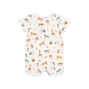 Take a walk on the wild side with our Organic Cotton Short Sleeve Romper in the enchanting Safari animal print. Crafted from soft, breathable organic cotton jersey, this romper is as comfy as it is playful-perfect for everyday adventures, nap time or tummy time. The whimsical safari-inspired print brings lions, giraffes, zebras and more to life in a palette of warm desert tones. With an easy zip front opening for fuss-free changes, this romper makes getting dressed a breeze.