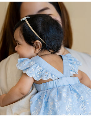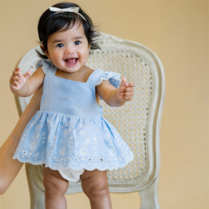 A little outfit made for memory-making days. With sweet scalloped embroidery and delicate shoulder frills, this sky-blue overlay dress romper is a picture of classic charm and playtime comfort. Whether it's a picnic in the park or a family celebration, your little one will look oh-so-lovely.
