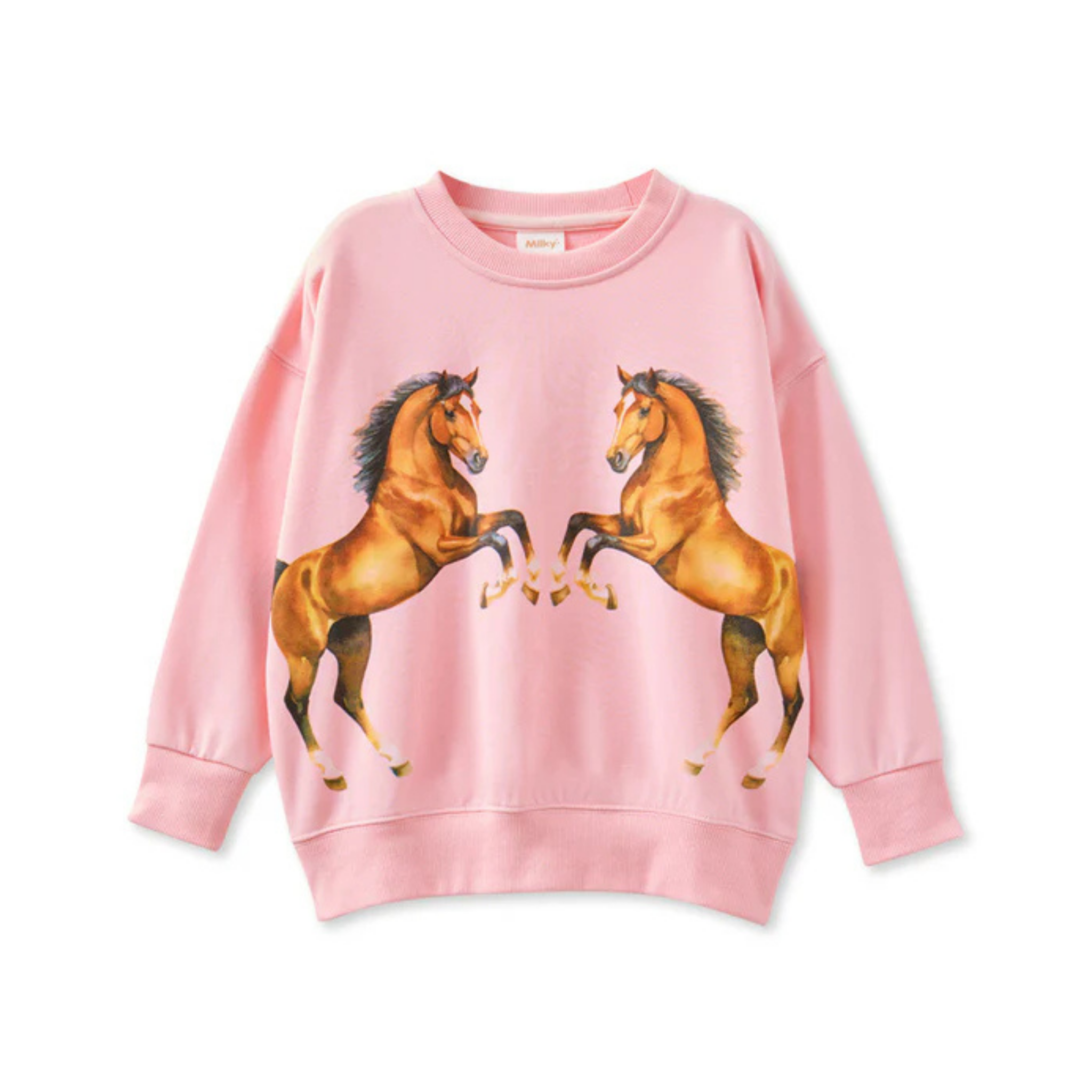 Milky Clothing Dancing Ponies Sweat. A little bit magical, a whole lot of comfy. The Dancing Ponies Sweat features two prancing ponies on a soft pink fleece base, perfect for the horse lovers, dreamers, and playground twirlers. Designed to keep them warm without weighing them down, this cosy crew is equal parts fun and functional. Pair with leggings or a skirt and let the galloping adventures begin.