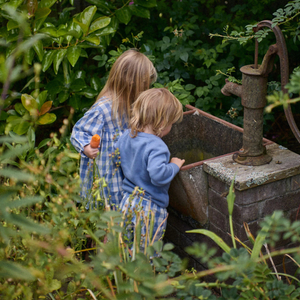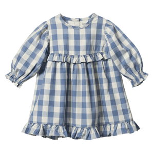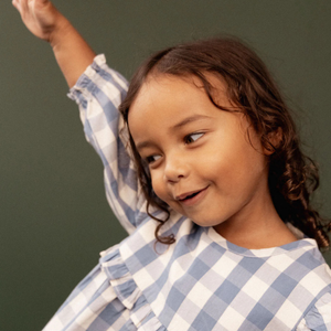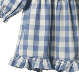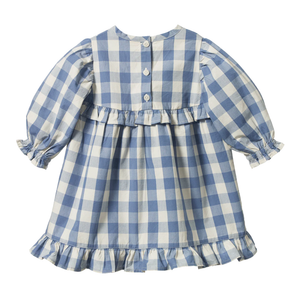 The Nora Dress is made from a beautifully soft woven cotton. Featuring a gathered skirt with frill details and gathered sleeves with soft elastic hems, the Nora Dress is perfect for play or special days. Finished with a corozo nut button closure at the back for easy dressing.