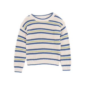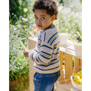 This gorgeous multi striped fisherman's rib knit jumper is the perfect winter wardrobe addition offering a stylish element which can be layered for added warmth. Match back with the Boys pull on denim jeans for a complete outfit choice.