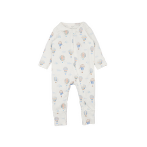 This cozy Organic Cotton Zip Romper, featuring the hot air balloons! Designed with comfort and practicality in mind, this footed romper features a centre front zip with a protective safety fold, plus fold-over mittens to keep tiny hands warm and prevent scratching. Crafted from soft, breathable Organic Cotton, it's perfect for sleep or play. Match it back with the Axel blanket for a coordinated gift.