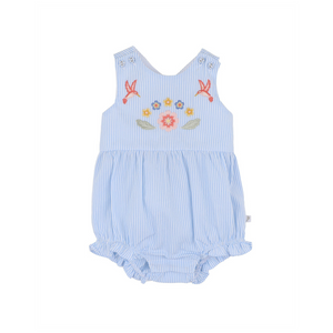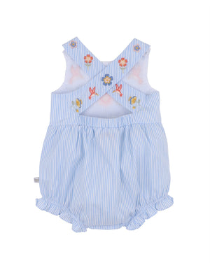 A sweet and sunshine-ready style, this blue stripe romper is bursting with playful charm. Featuring delicate floral and bird embroidery and cross-back straps, it's a whimsical piece perfect for warm-weather adventures. Soft gathers and frill leg openings add to its baby-friendly appeal.