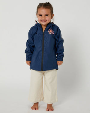 Designed in a navy colourway with two pockets, zip closure, elasticated cuffs, fixed hood and made in a waterproof fabric.
