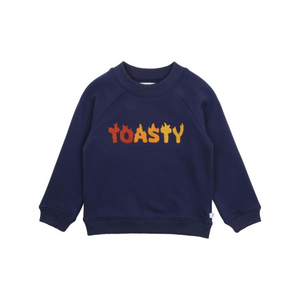 This navy French terry sweat top with a "TOASTY" embroidered boucle graphic is the perfect winter wardrobe addition offering a stylish element which can be layered for added warmth. Match back with the Boys pull on jean or the Boys tan twill pants for a complete outfit choice.