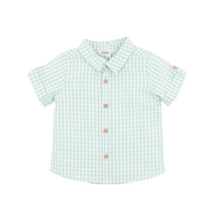 A fresh take on a classic, this green gingham shirt brings a crisp and playful twist to your little one's wardrobe. Made from lightweight cotton, it's ideal for warmer days-whether layered over a tee or worn on its own. Buttoned sleeve tabs offer a versatile rolled-up look, while the back yoke pleat adds ease and comfort for all-day wear.