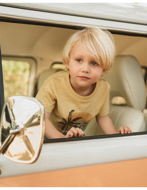 Let them chase the waves in this bold yellow surf tee, designed for sunny days and salty breezes. Featuring a retro beach scene and comfy cotton feel, it¿s the ultimate summer staple. Match it back with our Surfs Up stripe shorts for a laid-back coastal look.