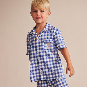 Made from soft cotton sateen, these pyjamas feature an all over custom navy check print, a soft and stretchy waistband to keep little tummies comfy and a special front pocket with Huxbear embroidery.