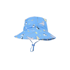 A day in the sun is even more fun with this playful printed bucket hat, made for little explorers who love the seaside. Featuring cheerful puffins, seals, fish, and beachy extras, it's a splash of character and comfort all in one. Designed for practicality and play, it offers secure sun protection with a quick-release neck tie for added peace of mind.
