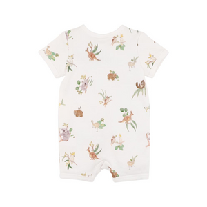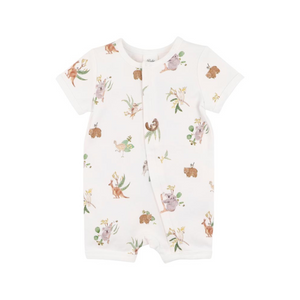 Perfect for warm-weather adventures and everyday play, this Organic Cotton Short Sleeve Zipsuit brings a touch of the wild with its adorable all-over print of Australia's favorite native animals. Featuring koalas, kangaroos, wombats and more, this playful piece celebrates Australian charm in the softest way. Crafted from breathable, natural Organic Cotton, it features a full-length front zip for quick changes, and a press stud at the neckline to keep the zip neatly in place. The short sleeves help keep little ones cool and comfortable, making it ideal for sunny days, playdates, or uniquely Australian gifting.